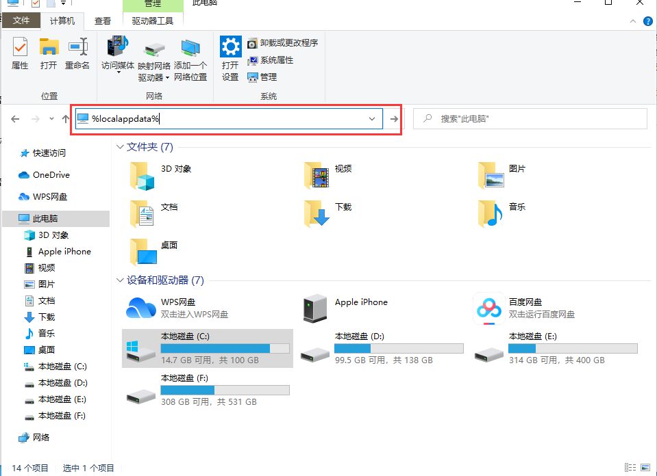 在电脑文件框中输入:%localappdata%,点击enter键